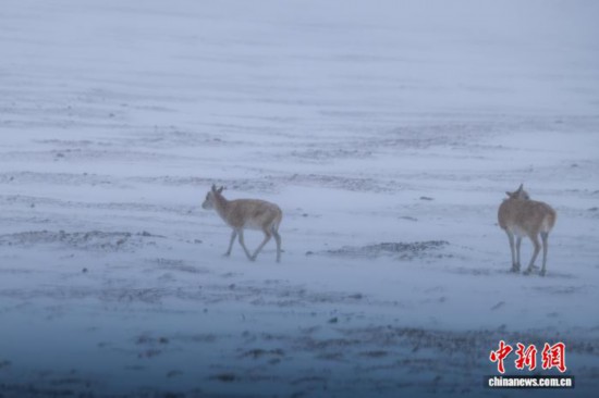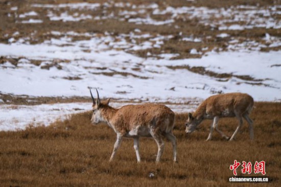 圖為10月9日,在兩隻藏羚羊在雪原中覓食。江飛波 攝