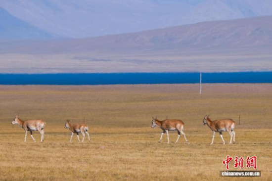 圖為10月10日,藏羚羊群在西藏那曲市的高原湖畔悠閑覓食。江飛波 攝