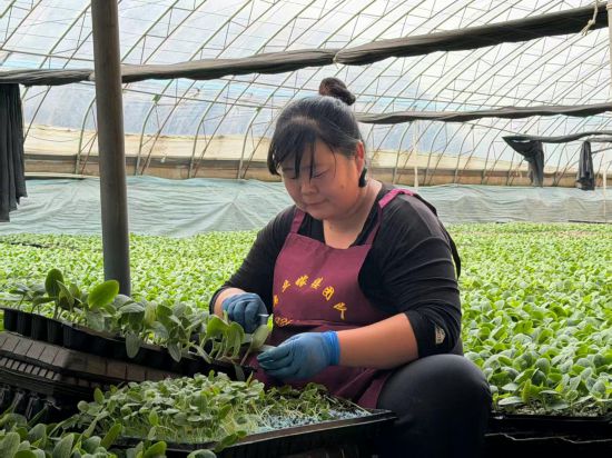 初春,在山東省聊城市莘縣董杜庄鎮梁丕營村,41歲的馬燕正在育苗大棚裡嫁接瓜苗。