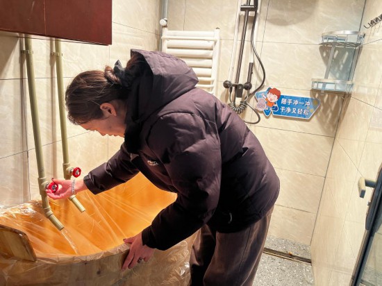 多吉卓瑪仔細清理每一間浴室,拖地、洗木桶、消毒、調溫度,一絲不苟。“我要把衛生做好,讓大家洗得安心、舒心。”她說。不知不覺,雙手在勞作中變得紅潤起來。