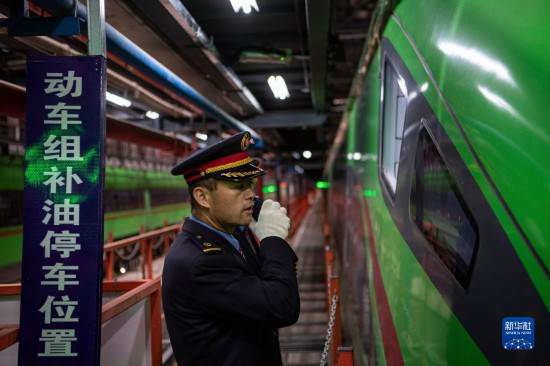 在拉萨机辆整备中心,黄起岗在和一体化调度中心确认动车组补油位置(1月11日摄)。新华社记者 孙非 摄