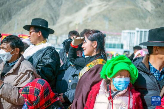 丹增(中)在森布日生态搬迁安置点观看赛马活动(1月24日摄)。新华社发(旦增努布 摄)