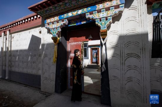 丹增在森布日生态搬迁安置点的新家门前(1月24日摄)。新华社记者 姜帆 摄
