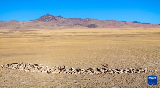 丹增在西藏那曲市尼玛县俄久乡马迁村老家的草场上牧羊(2023年12月18日摄,无人机照片)。新华社记者 姜帆 摄