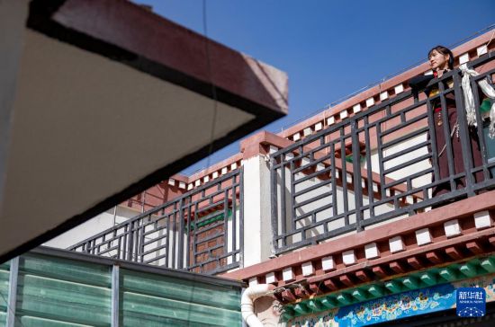 丹增在森布日生态搬迁安置点的新家阳台上看风景(1月24日摄)。新华社记者 姜帆 摄