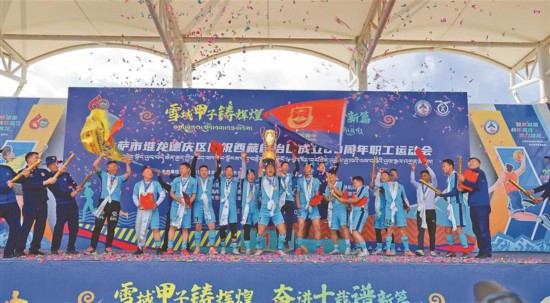图为足球比赛结束后,获奖队伍拿起奖杯欢呼。记者 拉巴桑姆 摄